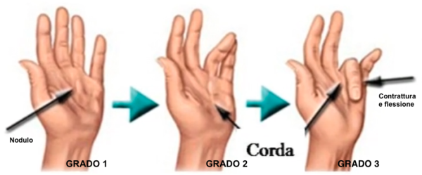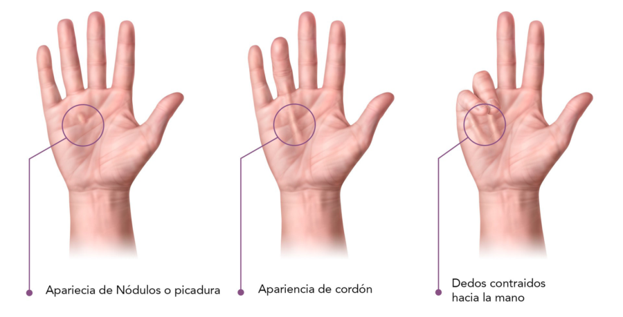 Clinicamente, i pazienti presentano inizialmente noduli palpabili nella regione palmare, spesso alla base del 4° o 5° dito, che evolvono in corde fibrose che tirano i dita verso la flessione.