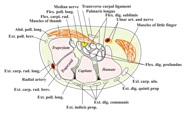 All’interno del canale decorrono anche i tendini flessori delle dita e del pollice, avvolti da guaine sinoviali che ne facilitano lo scorrimento. Quando lo spazio disponibile si riduce o aumenta il volume dei tessuti contenuti (ad esempio per ispessimento sinoviale o ritenzione di liquidi), la pressione intracanalare può aumentare e il nervo mediano diventa vulnerabile a sofferenza ischemica e alterazioni della conduzione.